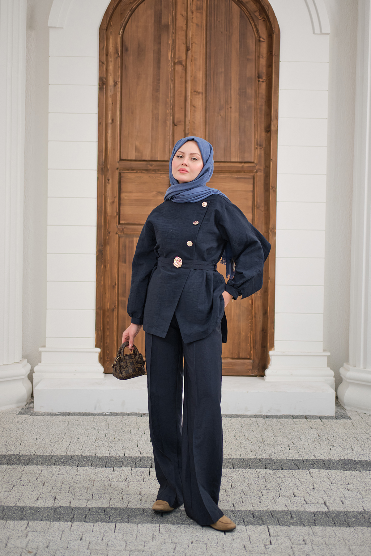 Gold Kemerli Düğme Detay Takım Lacivert
