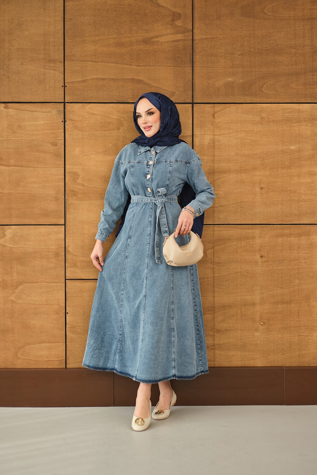 Gold Yarım Düğme Detaylı Bel Bağlamalı Kot Elbise Buz Mavi