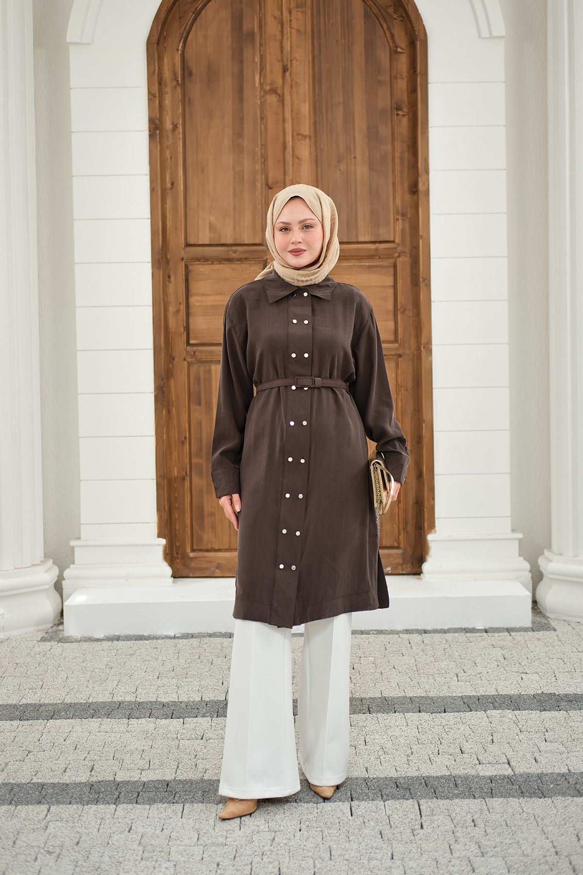 Gömlek Yaka Çift Düğmeli Uzun Tunik Kahverengi