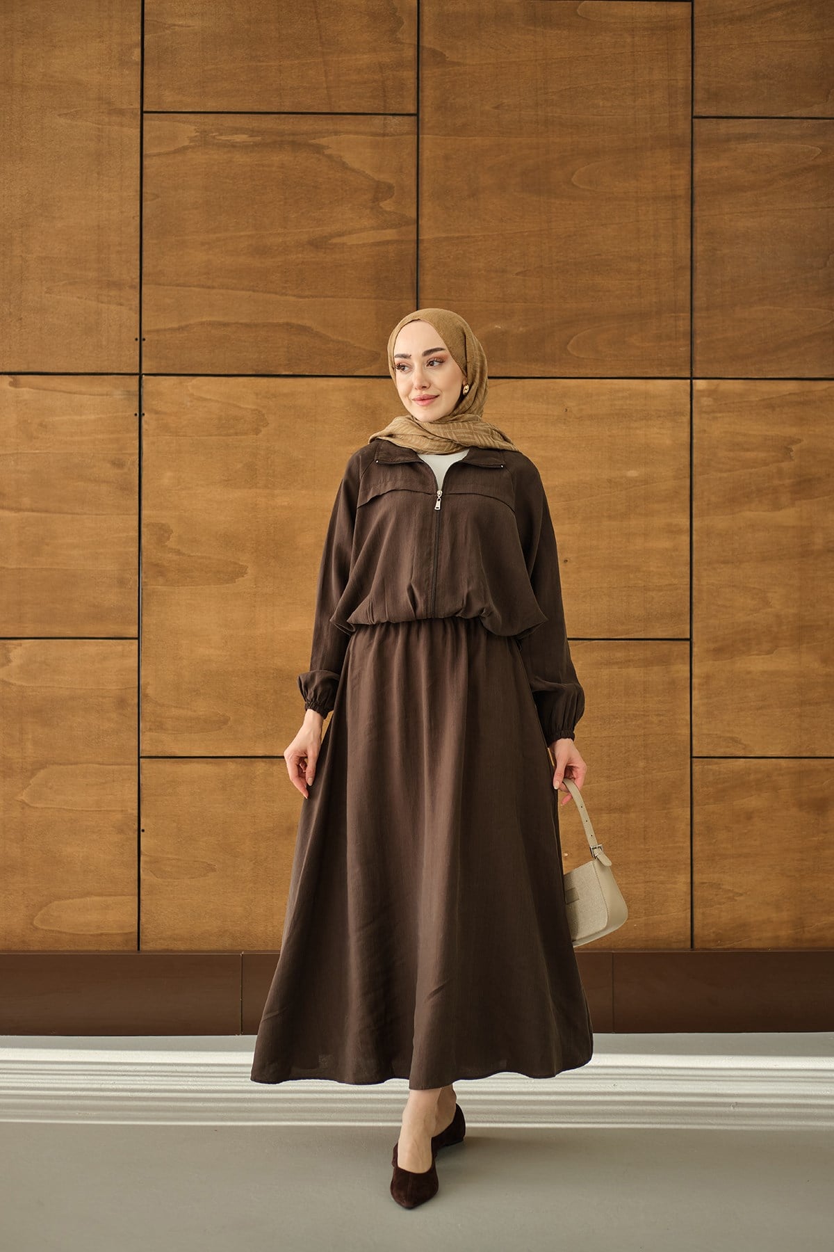 Gömlek Yaka Fermuarlı Etekli Takım Kahverengi