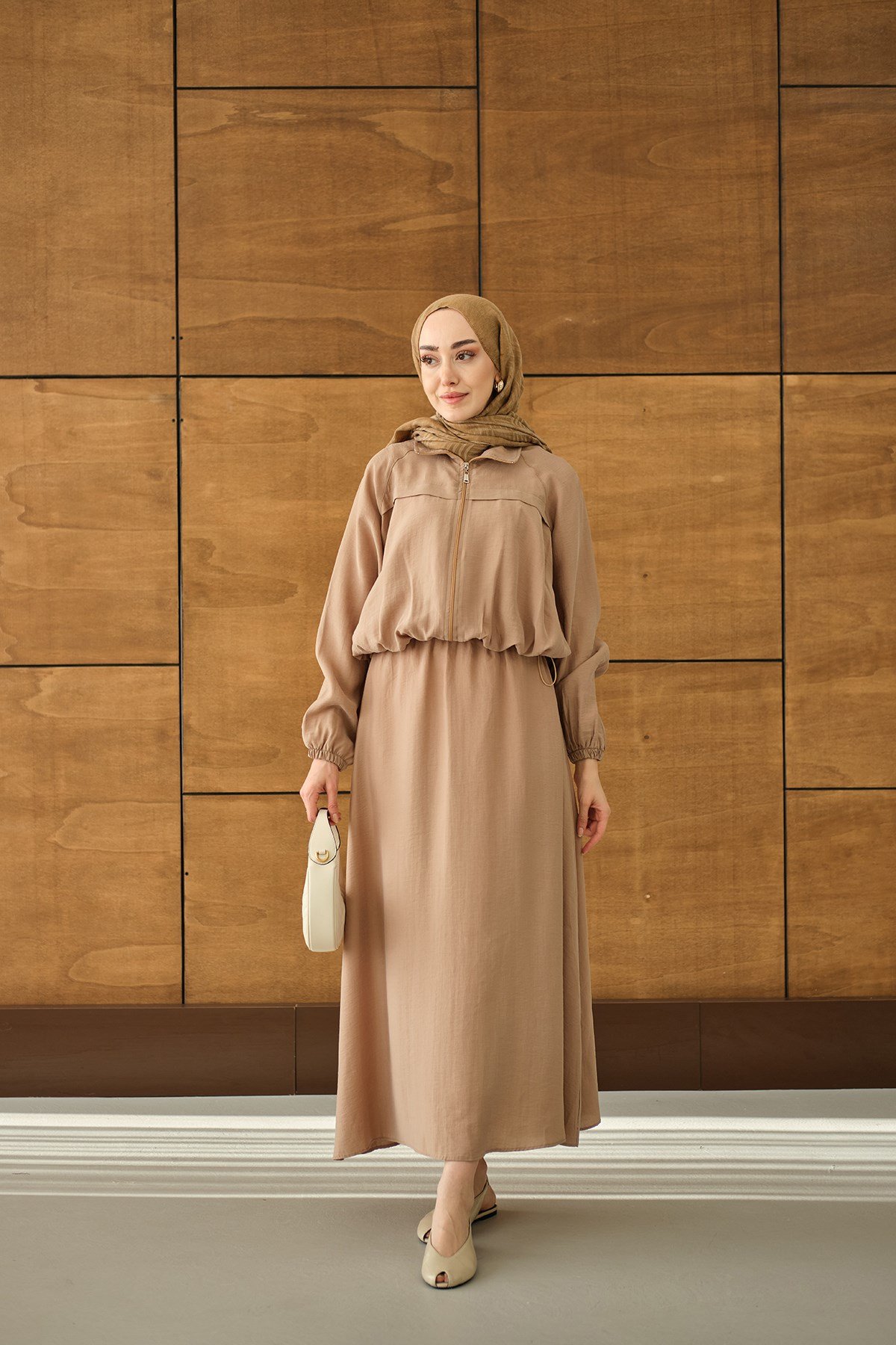 Gömlek Yaka Fermuarlı Etekli Takım Vizon