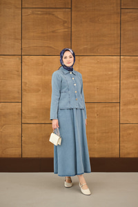 Gömlek Yaka Gümüş Düğme Detay Etekli Takım Buz Mavi