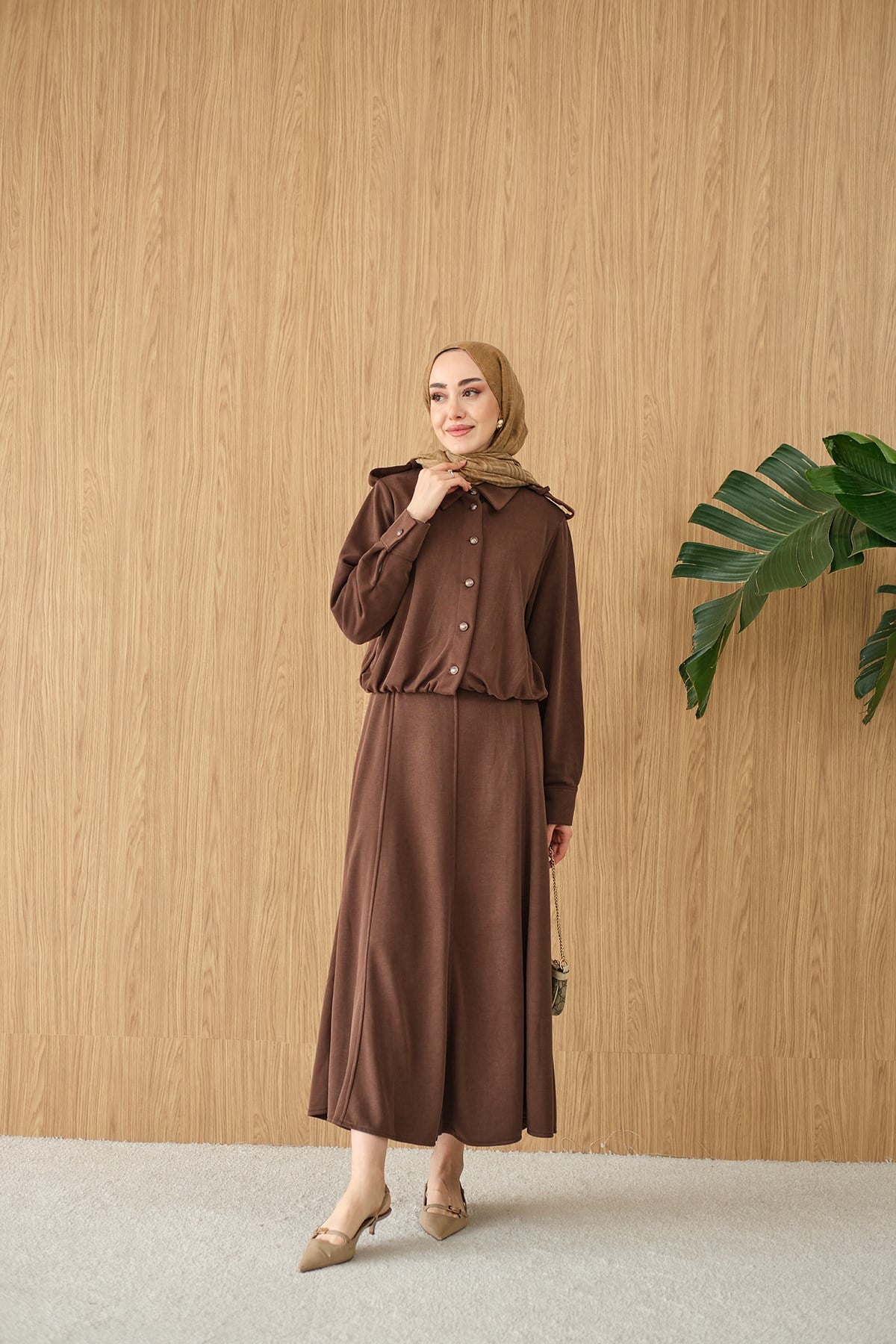 Gömlek Yaka Gümüş Düğme Detay Takım Kahverengi