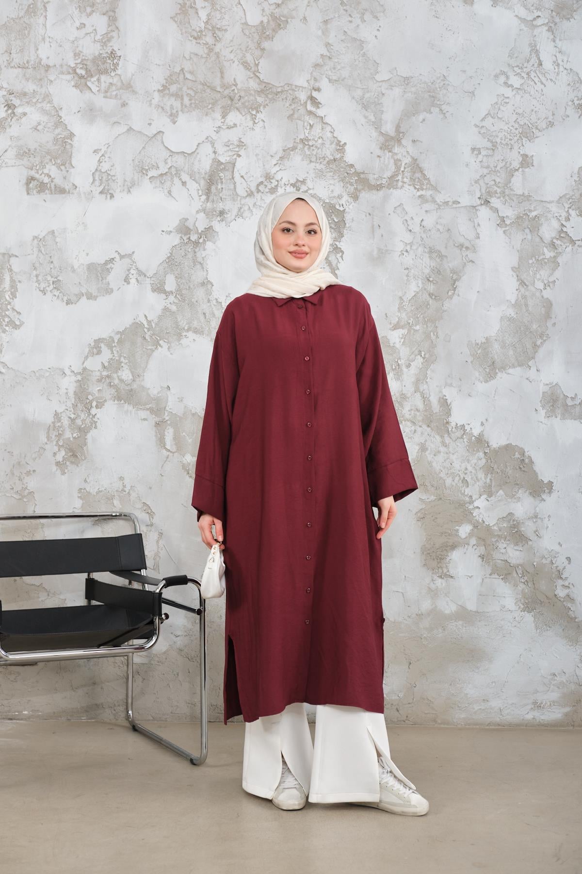 Midi Boy Düğmeli Gömlek Bordo