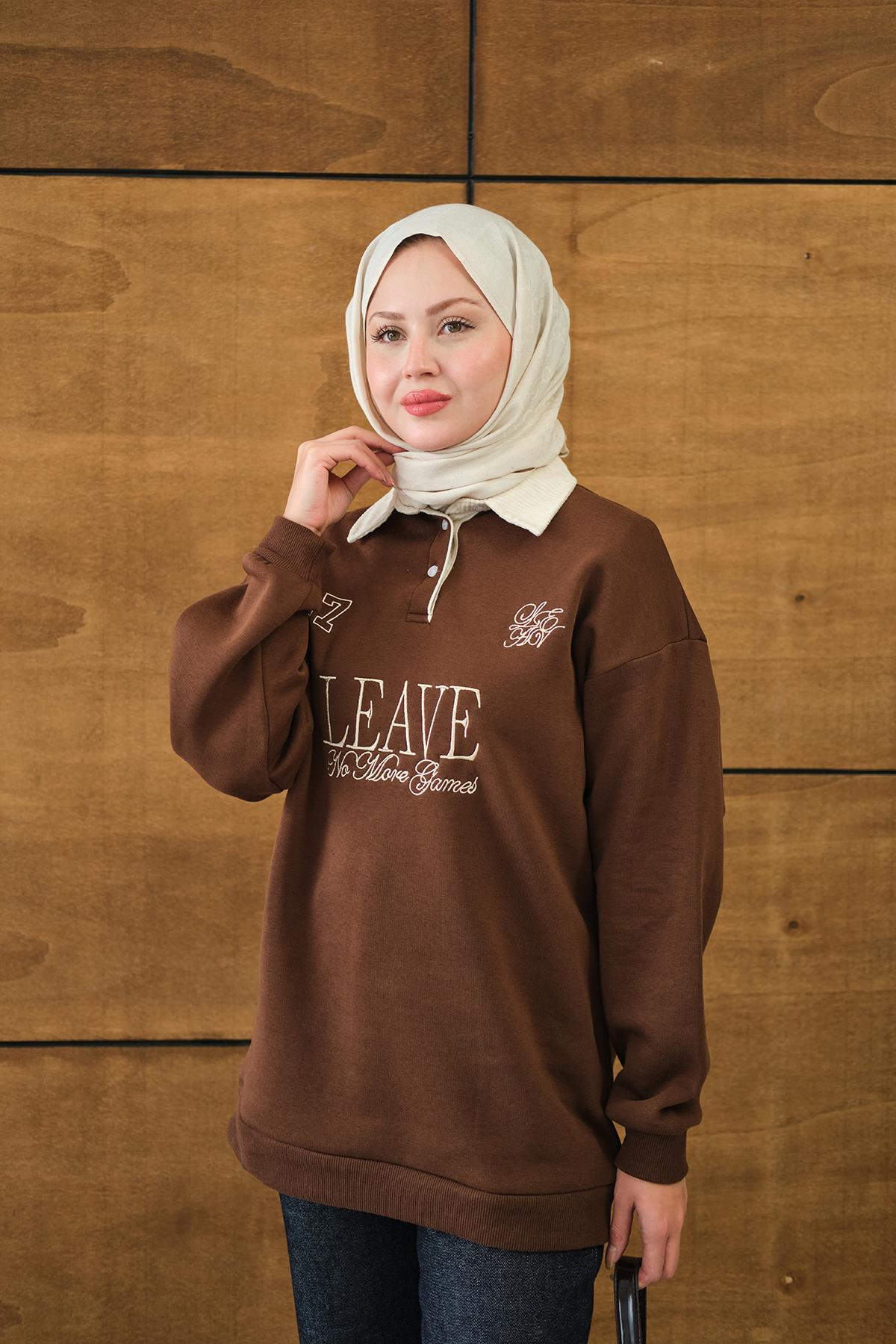 Gömlek Yaka Yazı Baskılı Sweat Kahverengi