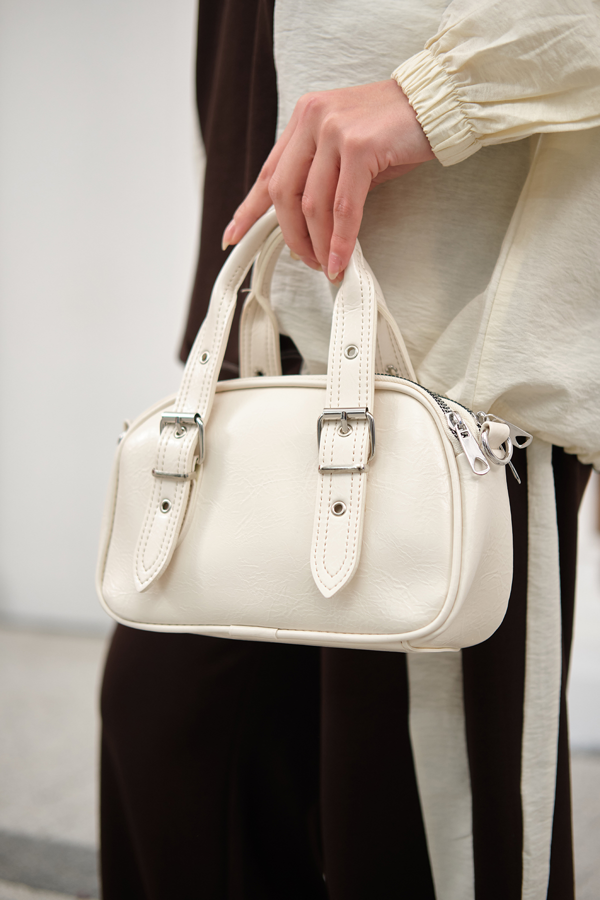 Göz Fermuarlı Saten Çanta Krem