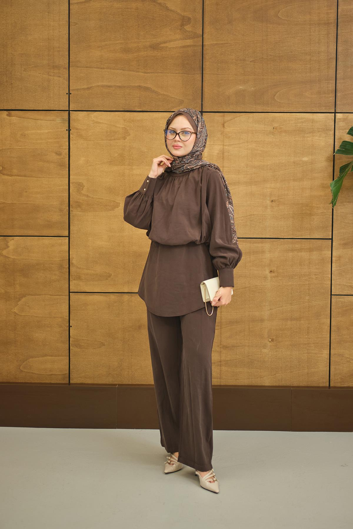Hakim Yaka Balon Bel Volanlı Slimfit Tencele Takım Kahverengi