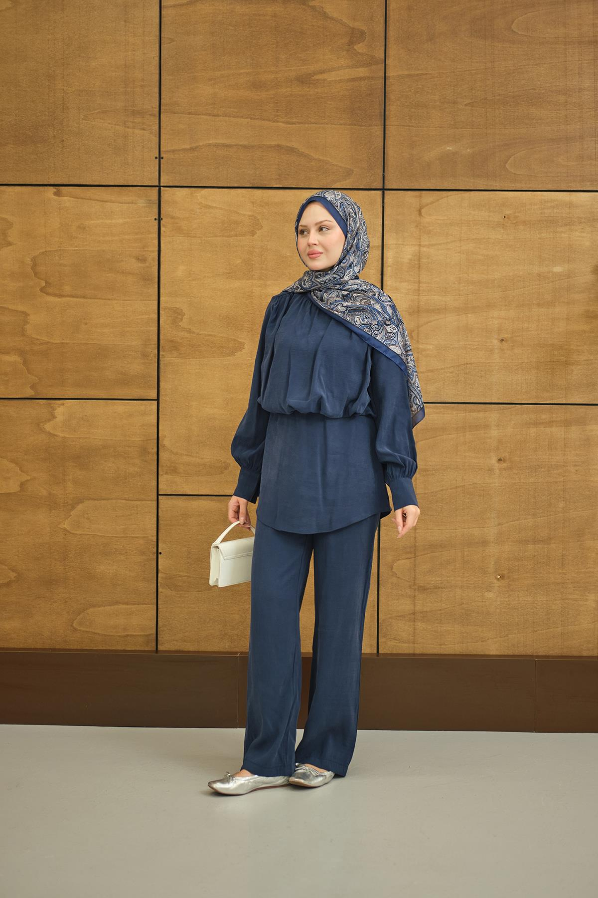 Hakim Yaka Balon Bel Volanlı Slimfit Tencele Takım Lacivert