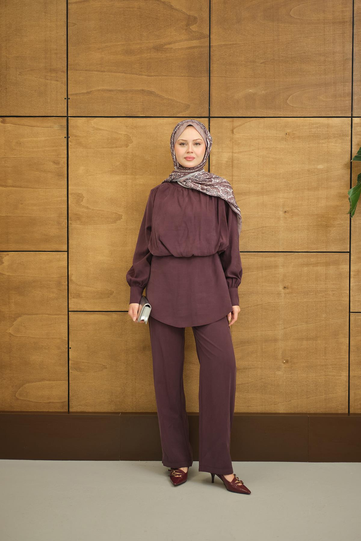Hakim Yaka Balon Bel Volanlı Slimfit Tencele Takım Mürdüm