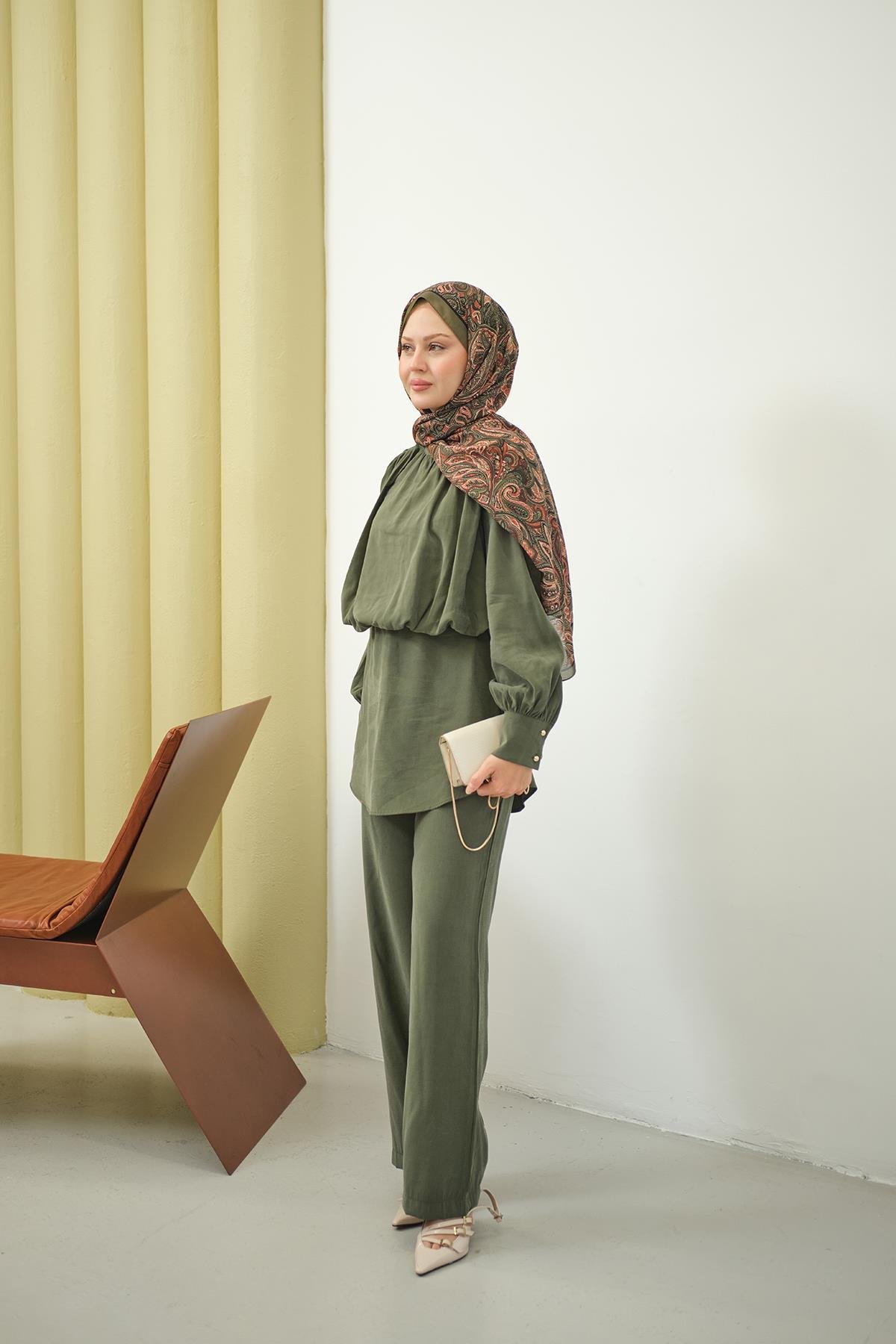 Hakim Yaka Balon Bel Volanlı Slimfit Tencele Takım Yeşil