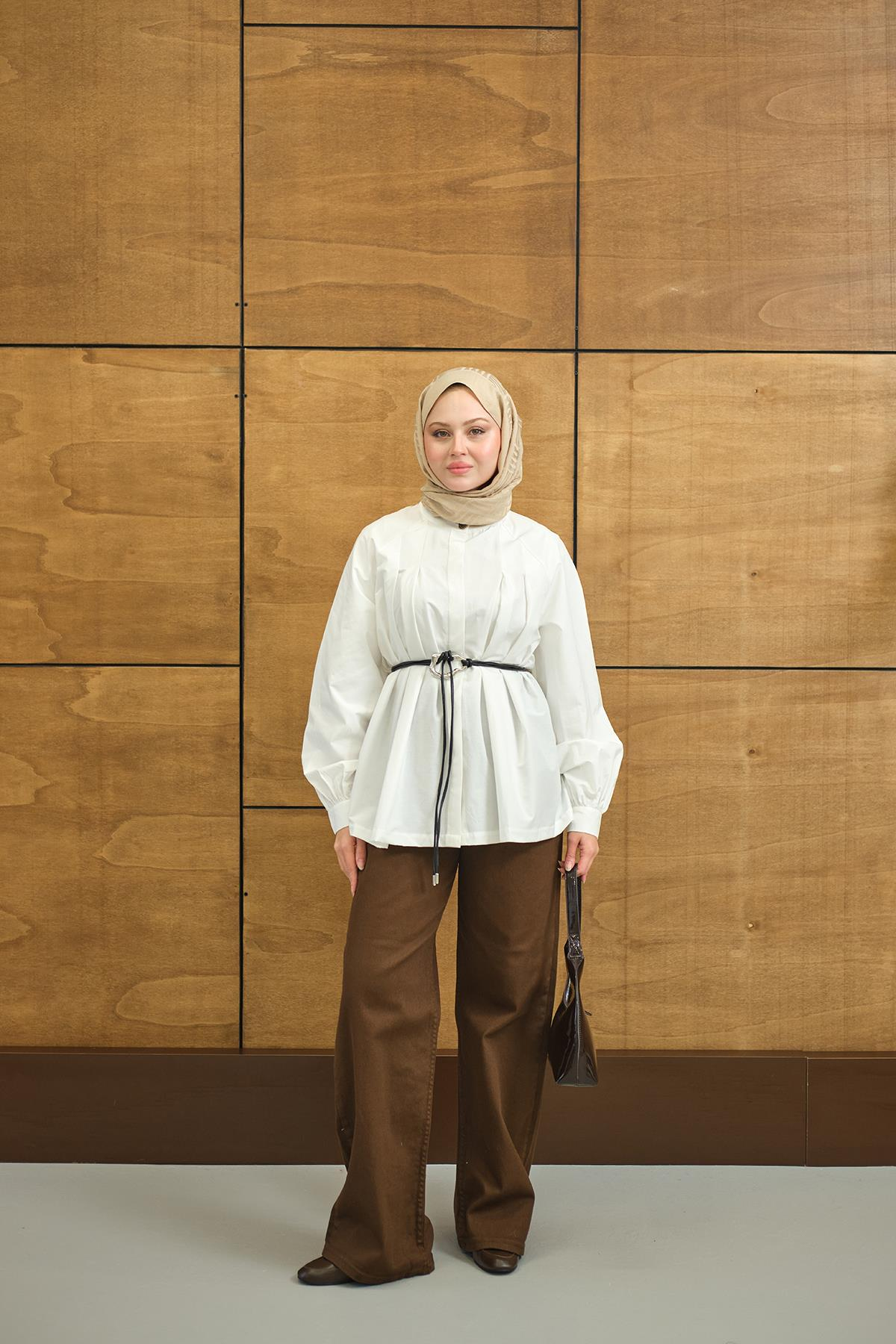 Hakim Yaka Pile Detay Çiçek Düğmeli Deri İp Kemerli Regular Poplin Gömlek Beyaz