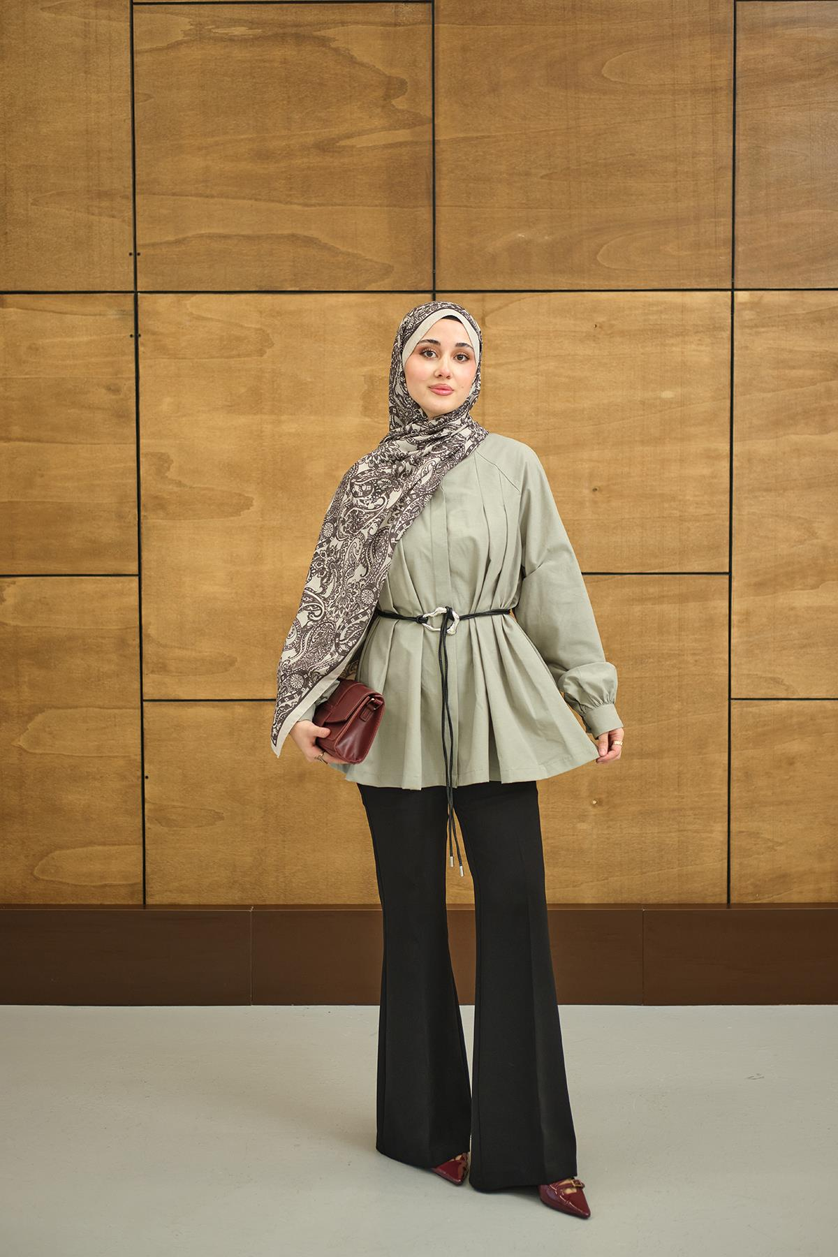 Hakim Yaka Pile Detay Çiçek Düğmeli Deri İp Kemerli Regular Poplin Gömlek Küf Yeşil