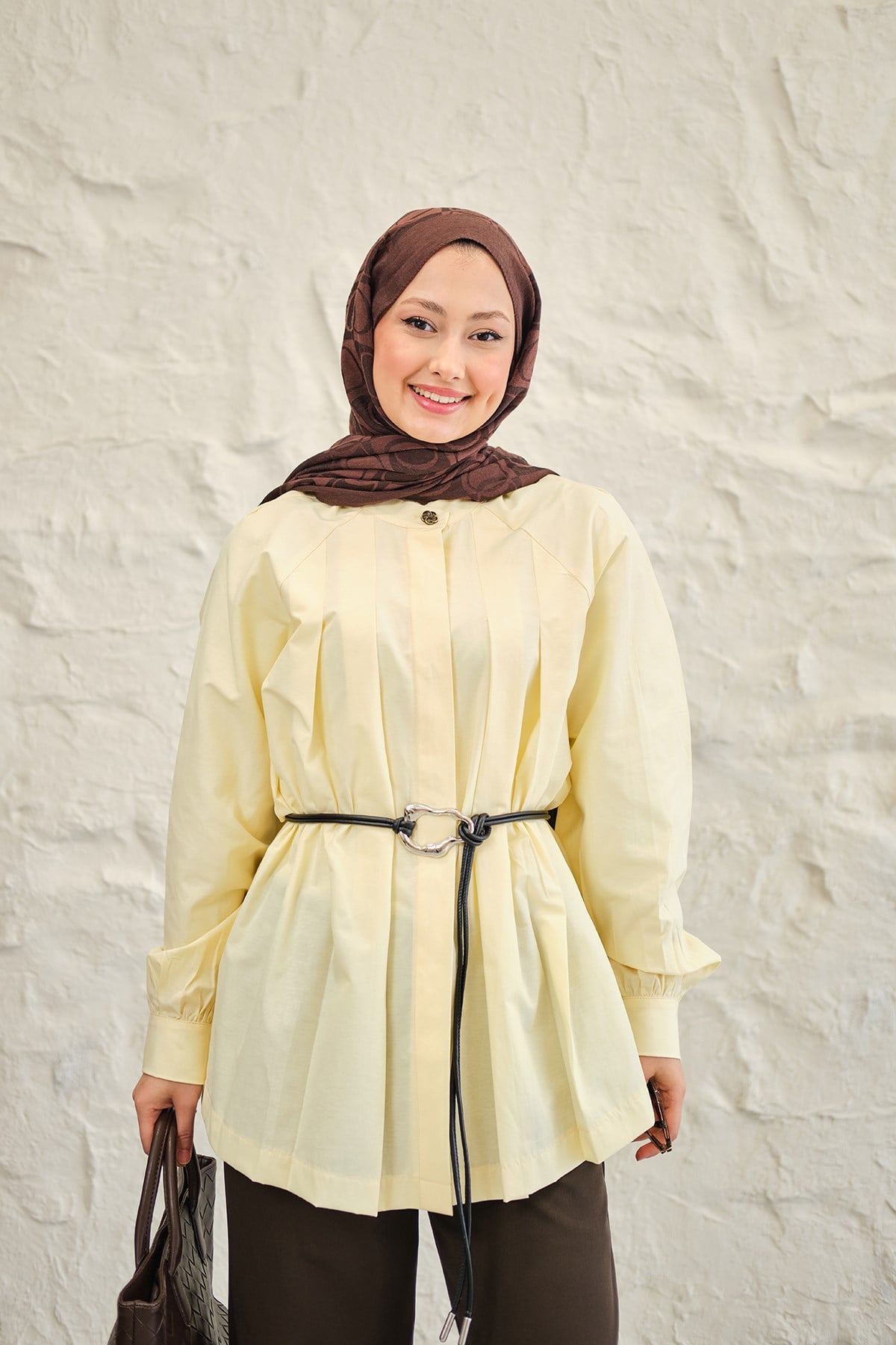 Hakim Yaka Pile Detay Çiçek Düğmeli Deri İp Kemerli Regular Poplin Gömlek Sarı