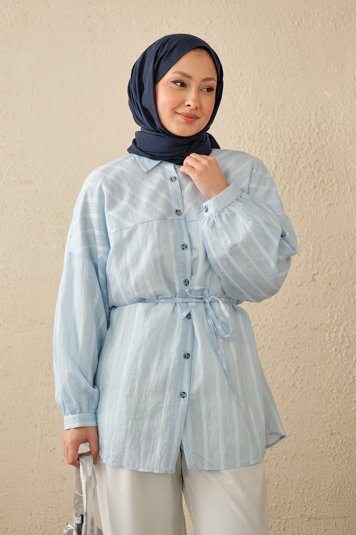 İnce Çizgi Desen Bel Bağlamalı Gömlek Bebe Mavi