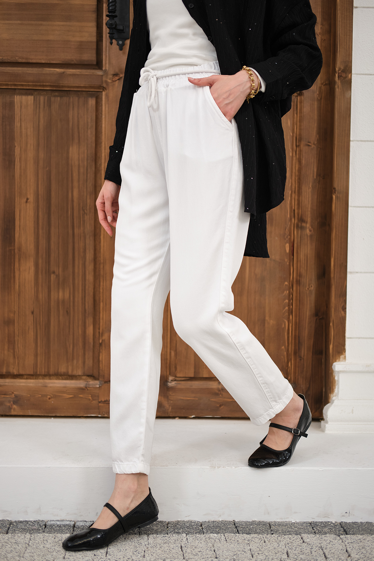 İp Kemerli Bol Paça Pike Pantolon Beyaz