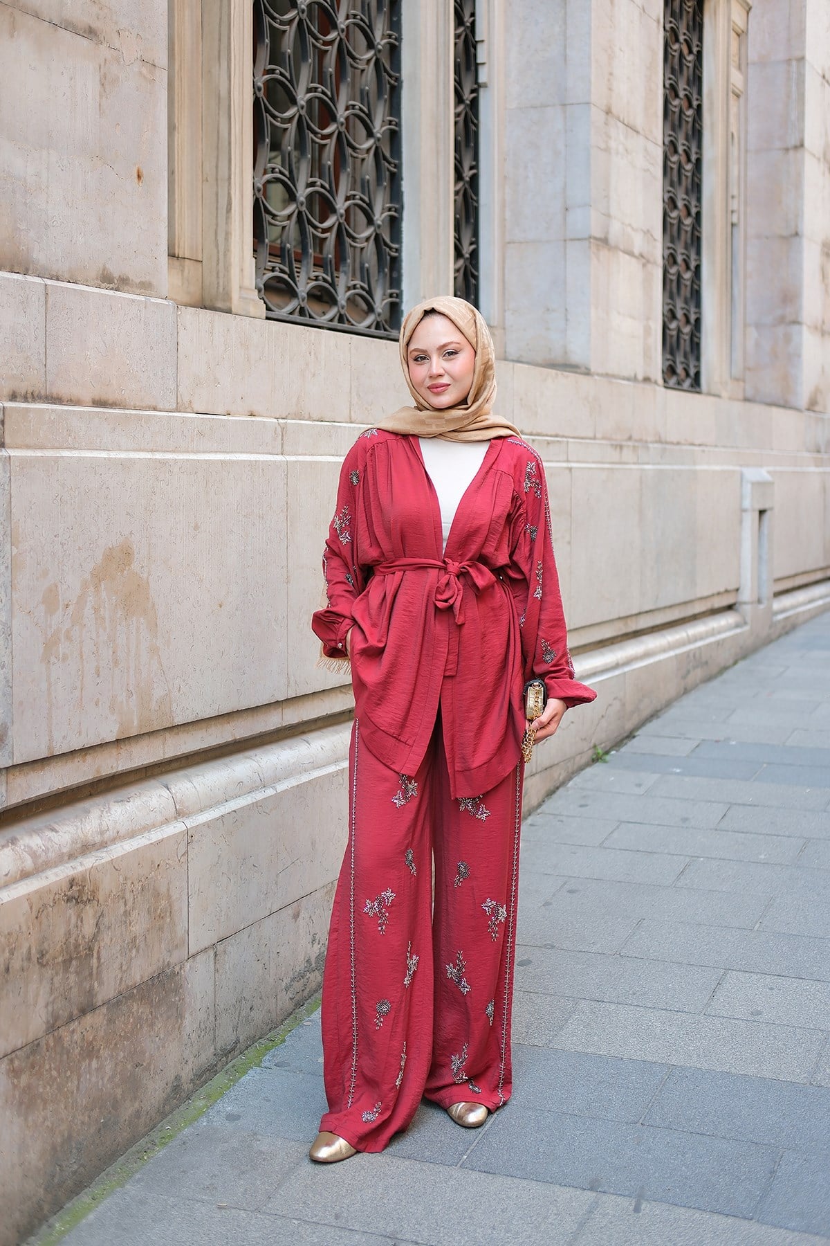 İşlemeli Kemerli Takım Kırmızı