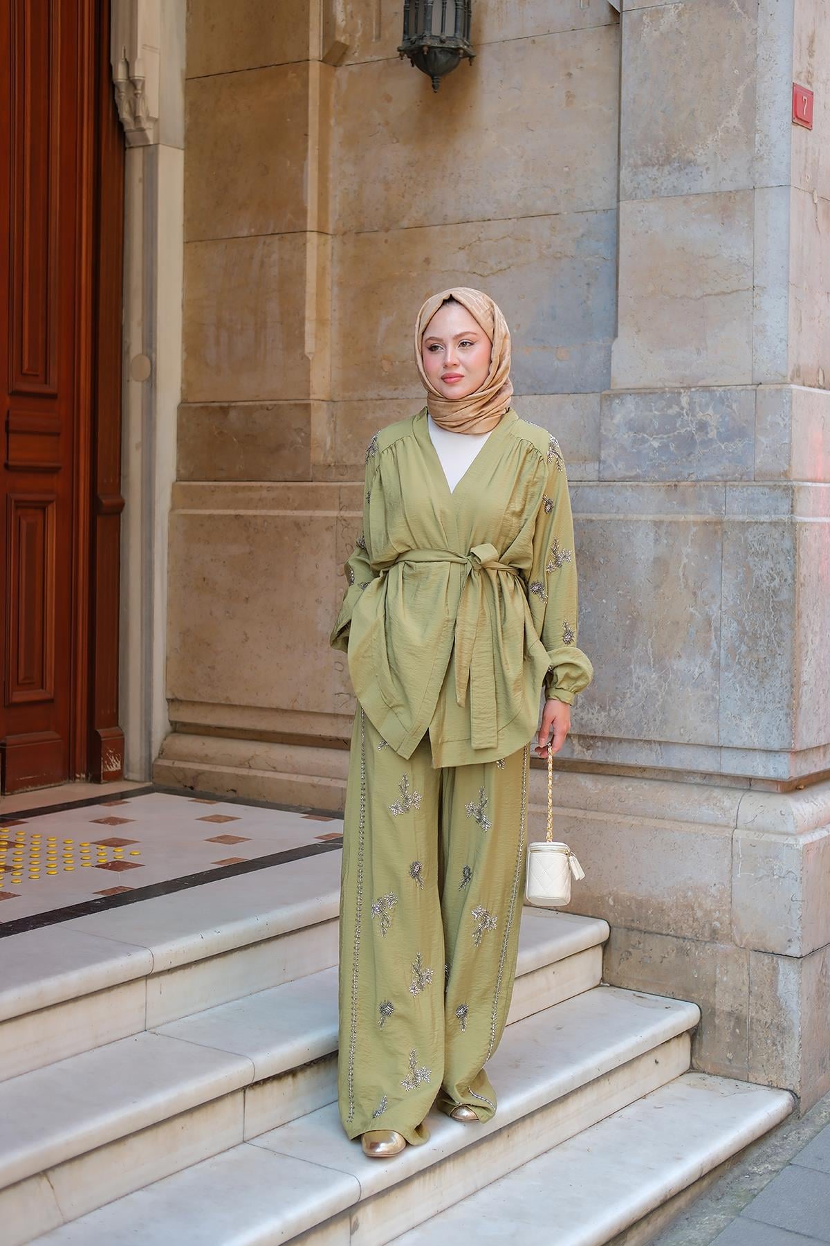 İşlemeli Kemerli Takım Yeşil