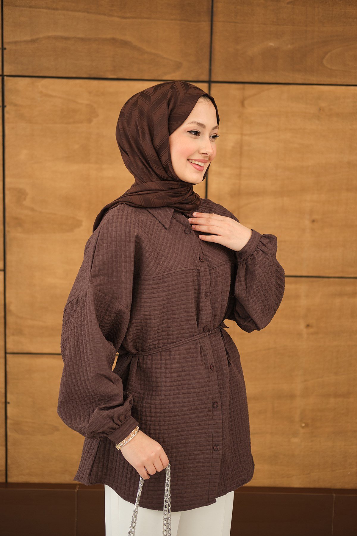 Kabartma Kare Desenli Gömlek Kahverengi