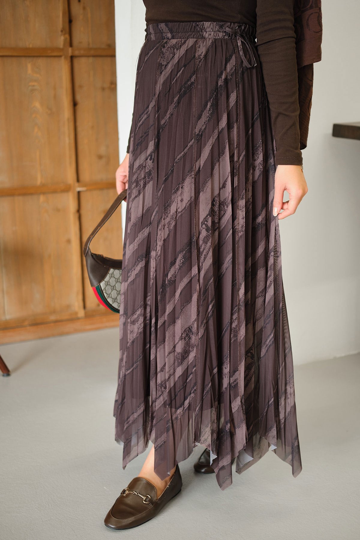 Kalın Fırça Desen Asimetrik Kesim Şifon Etek Kahverengi
