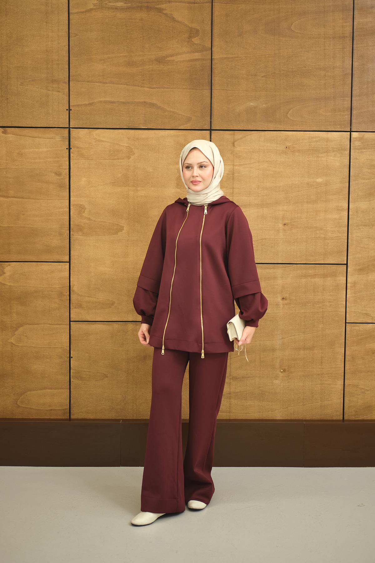 Kapüşonlu Çift Fermuar Detay Regular Scuba Takım Bordo
