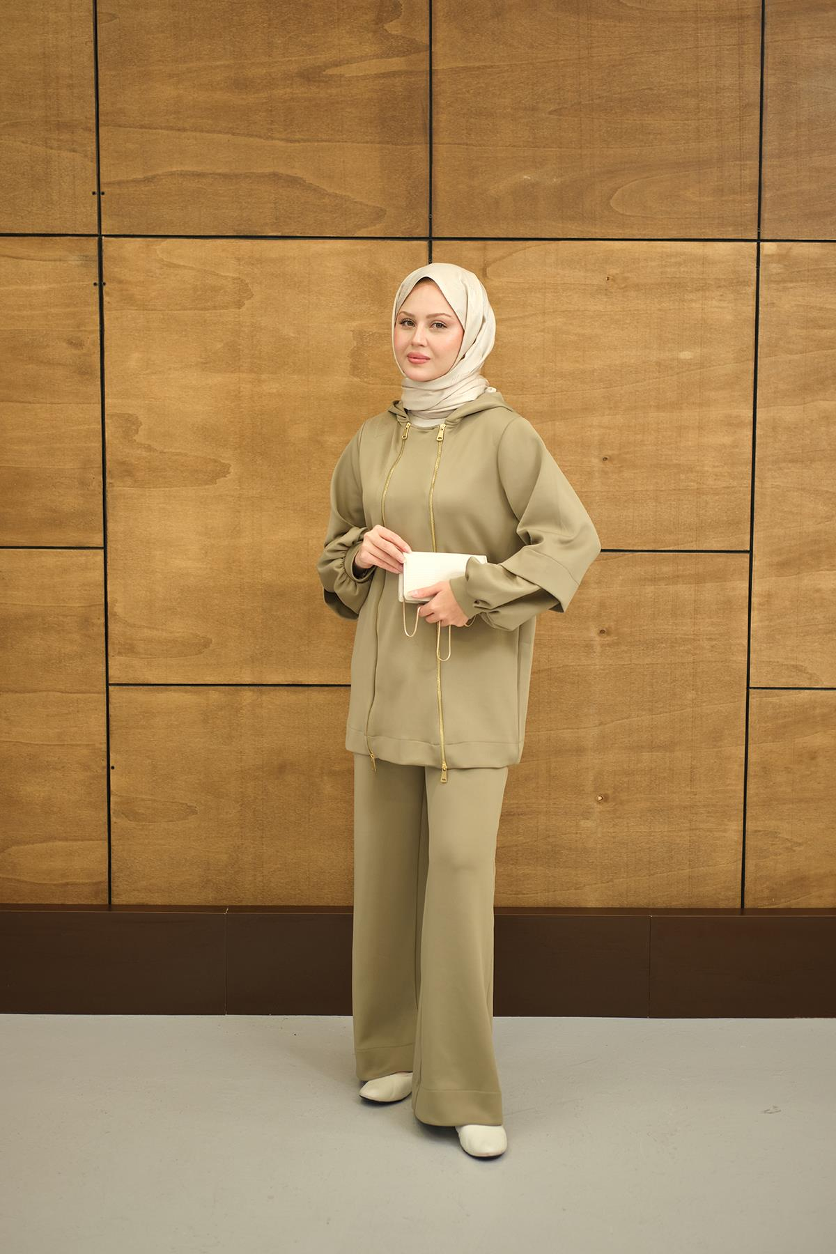 Kapüşonlu Çift Fermuar Detay Regular Scuba Takım Haki Yeşil