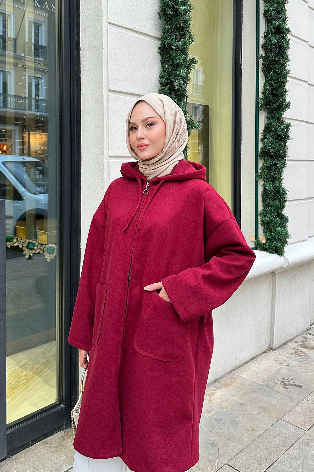 Kapüşonlu Fermuarlı Ara Boy Kaşe Bordo