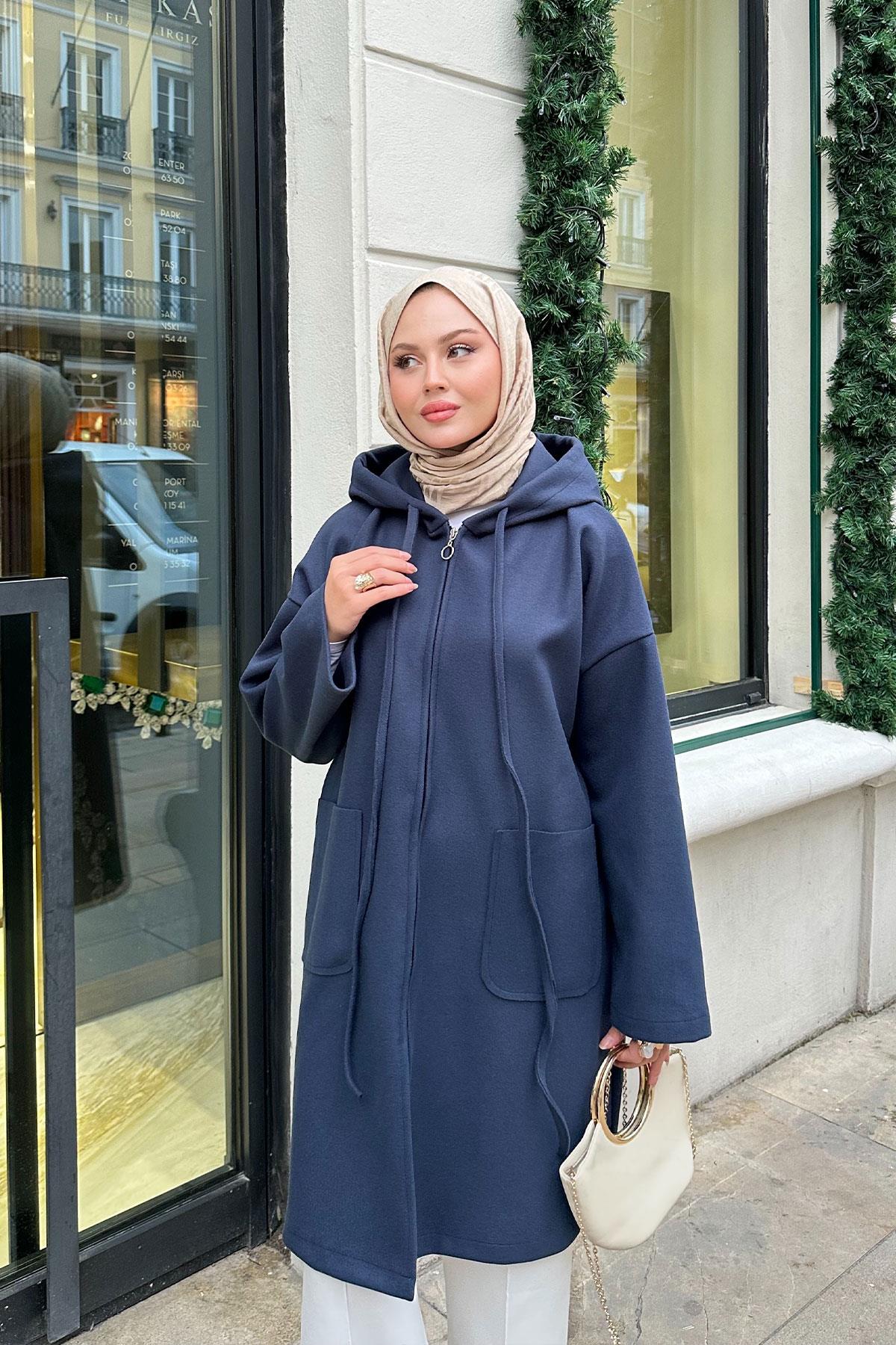 Kapüşonlu Fermuarlı Ara Boy Kaşe Mavi