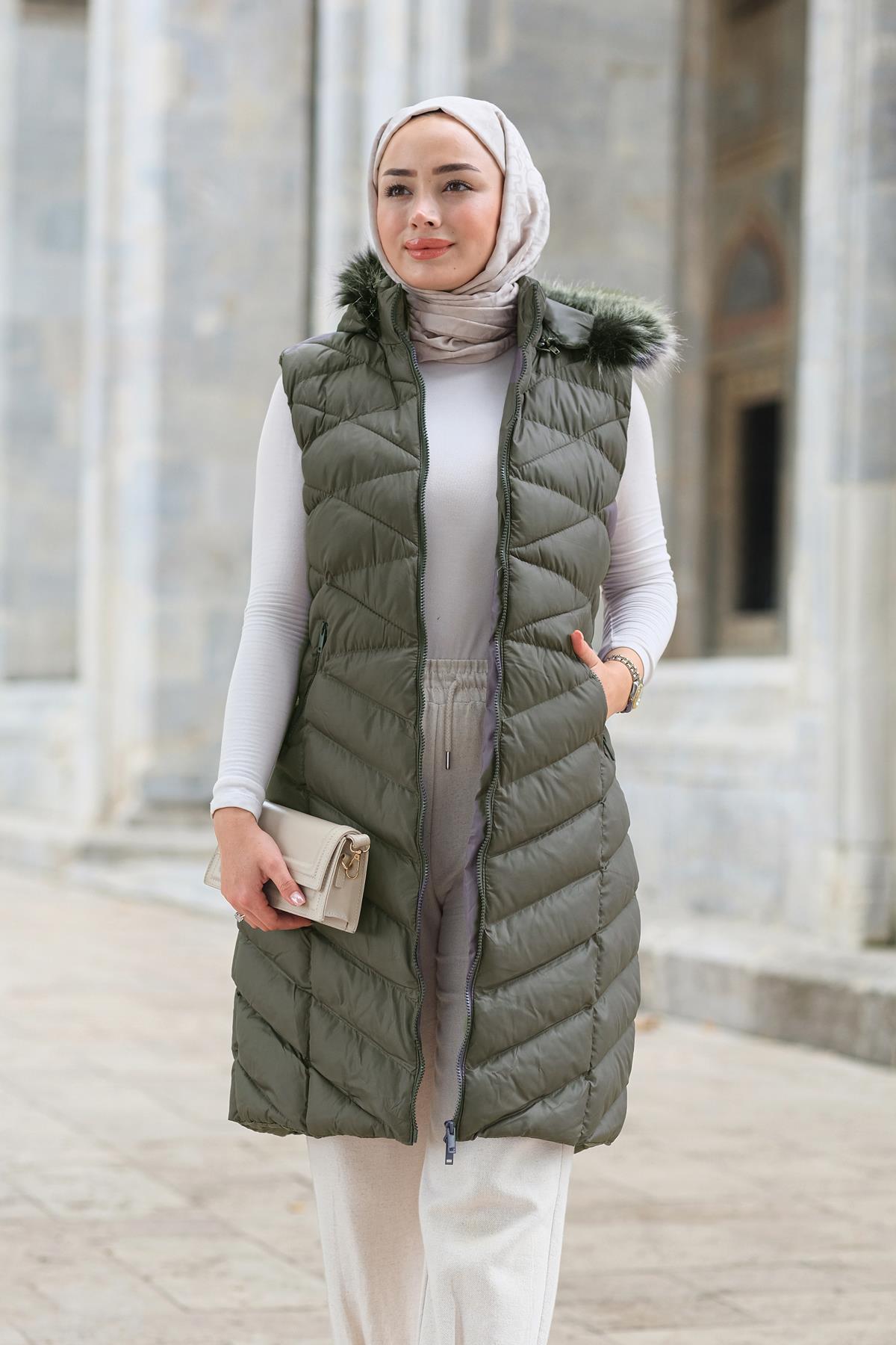 Kapüşonlu Kolsuz Şişme Yelek Haki Yeşil