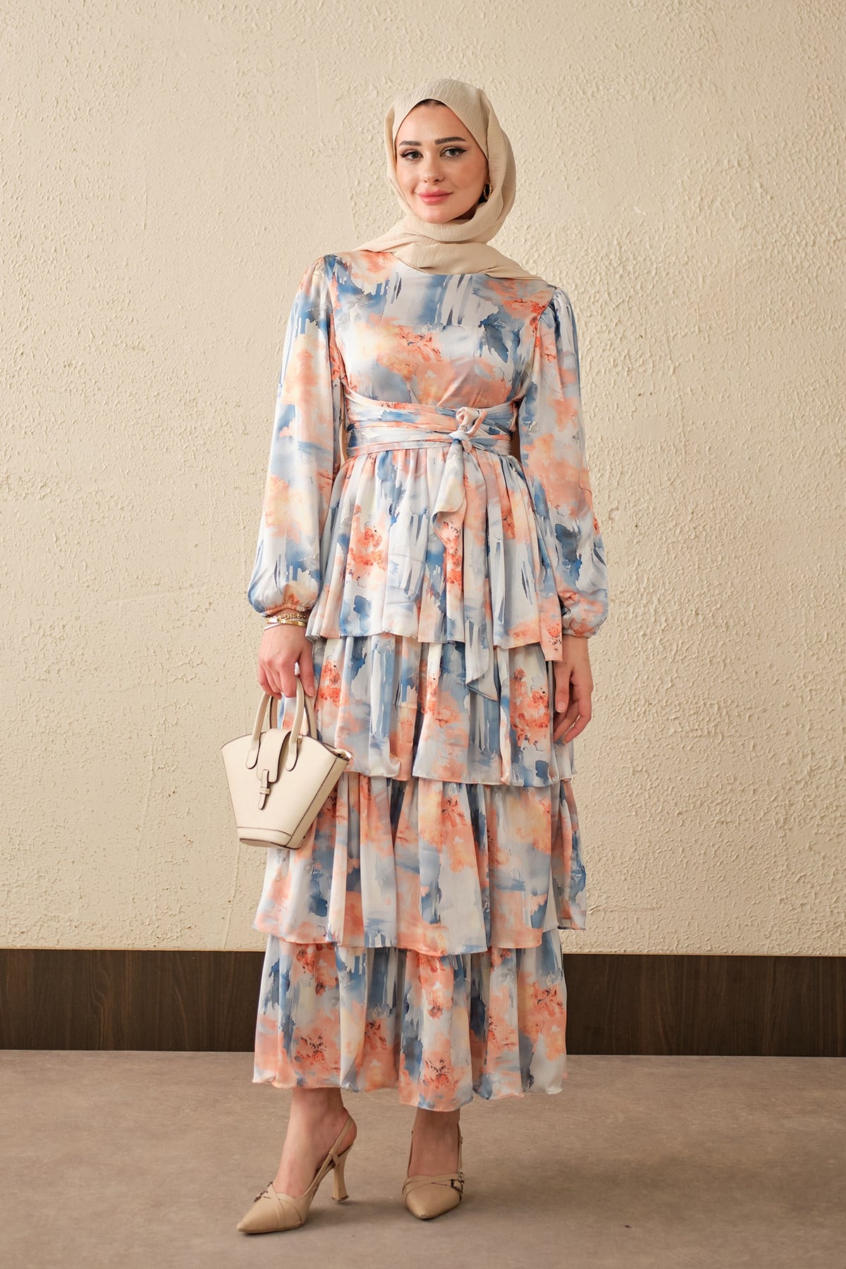 Karışık Desen Bel Bağlamalı Saten Elbise Somon
