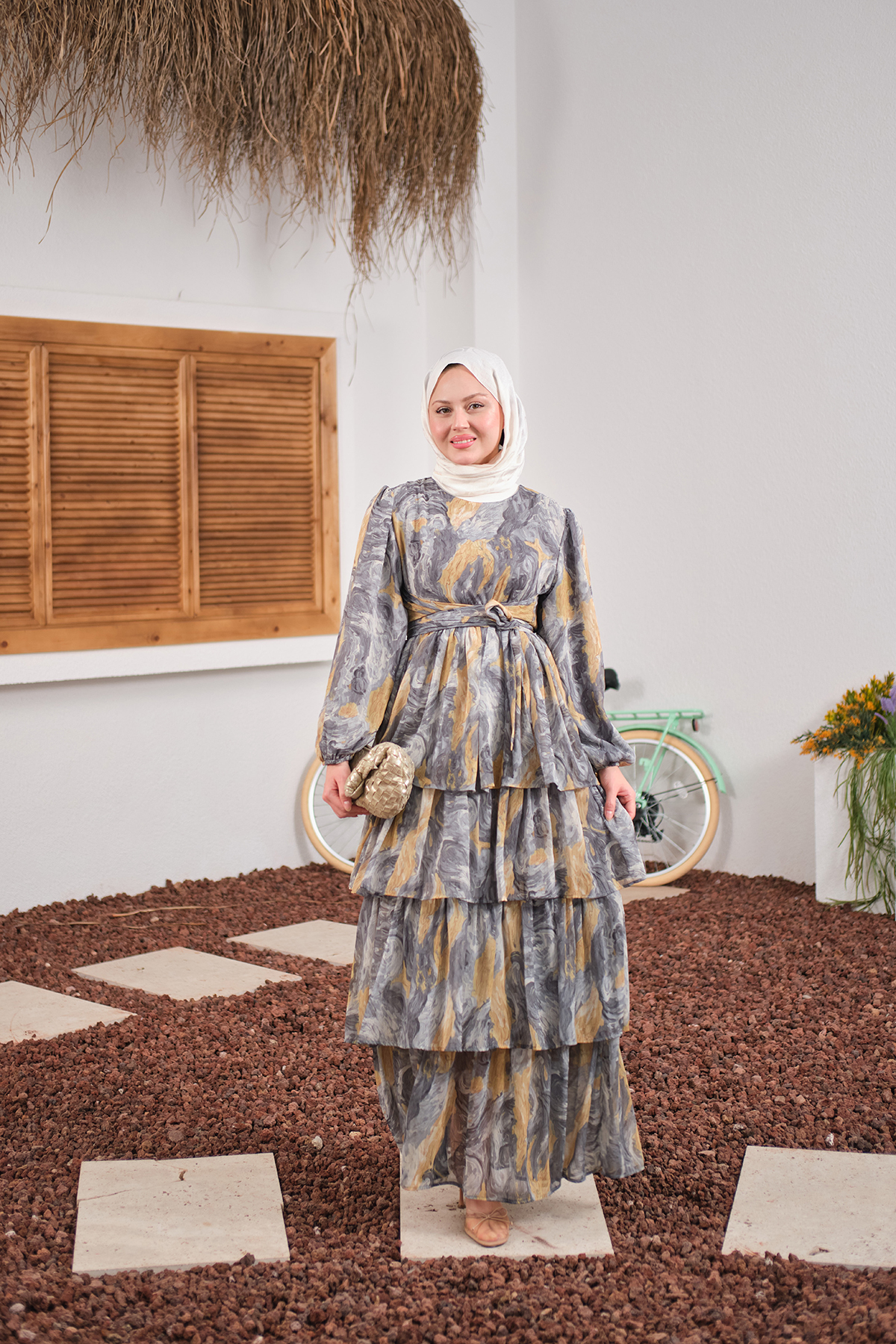 Kat Kat Detay Kuşaklı Astarlı Şifon Elbise Füme