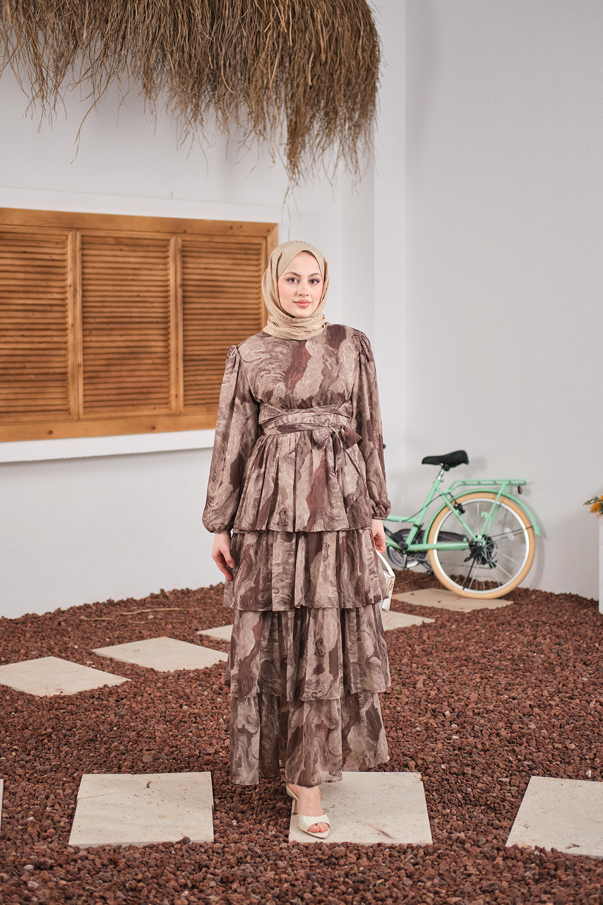 Kat Kat Detay Kuşaklı Astarlı Şifon Elbise Kahverengi