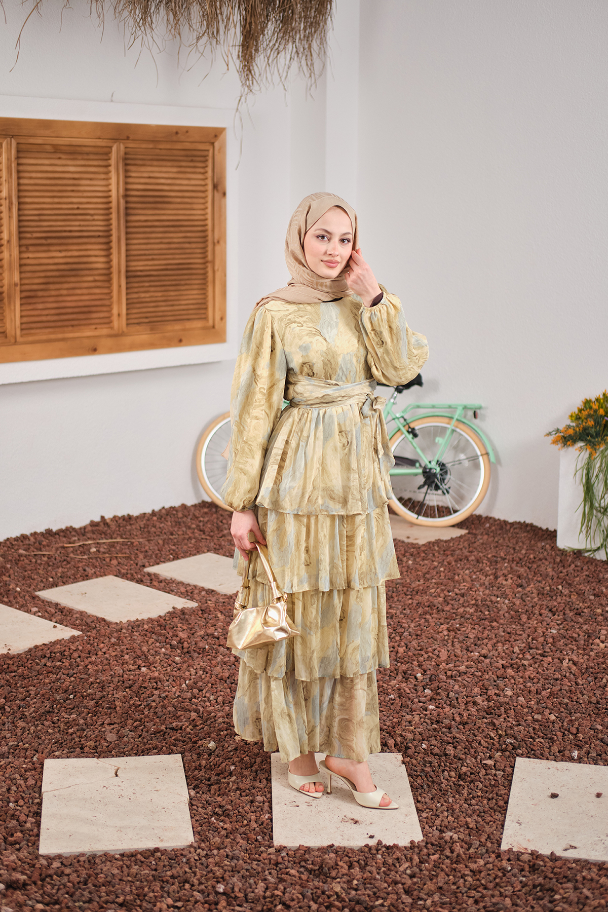 Kat Kat Detay Kuşaklı Astarlı Şifon Elbise Sarı