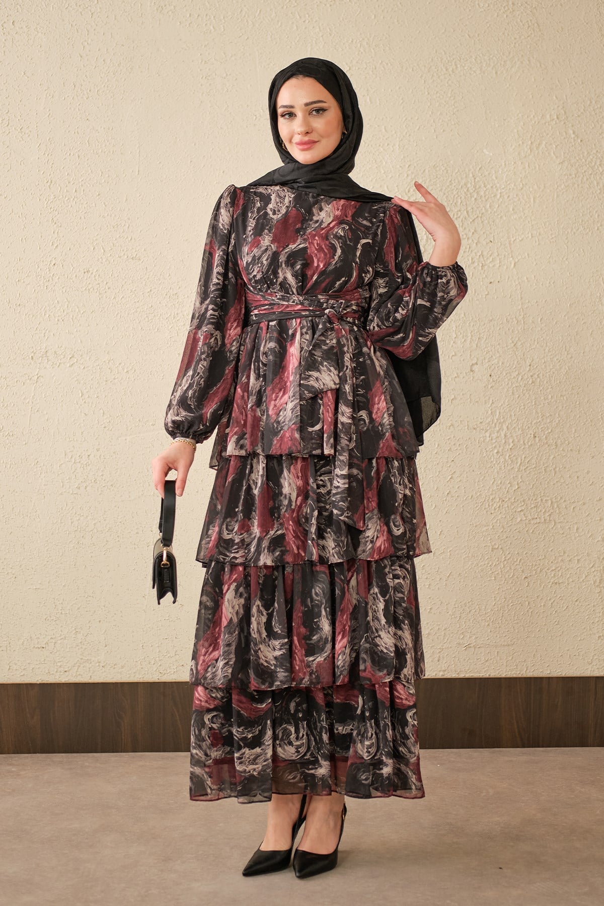 Kat Kat Detay Kuşaklı Astarlı Şifon Elbise Siyah