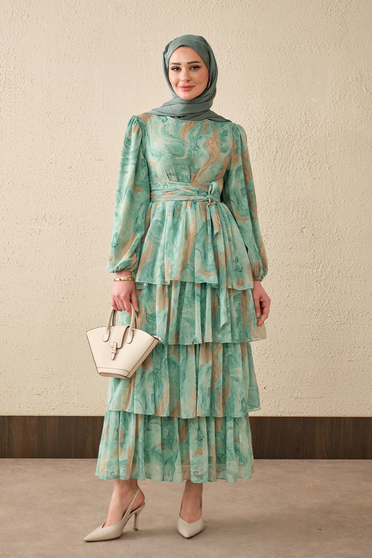 Kat Kat Detay Kuşaklı Astarlı Şifon Elbise Su Yeşil
