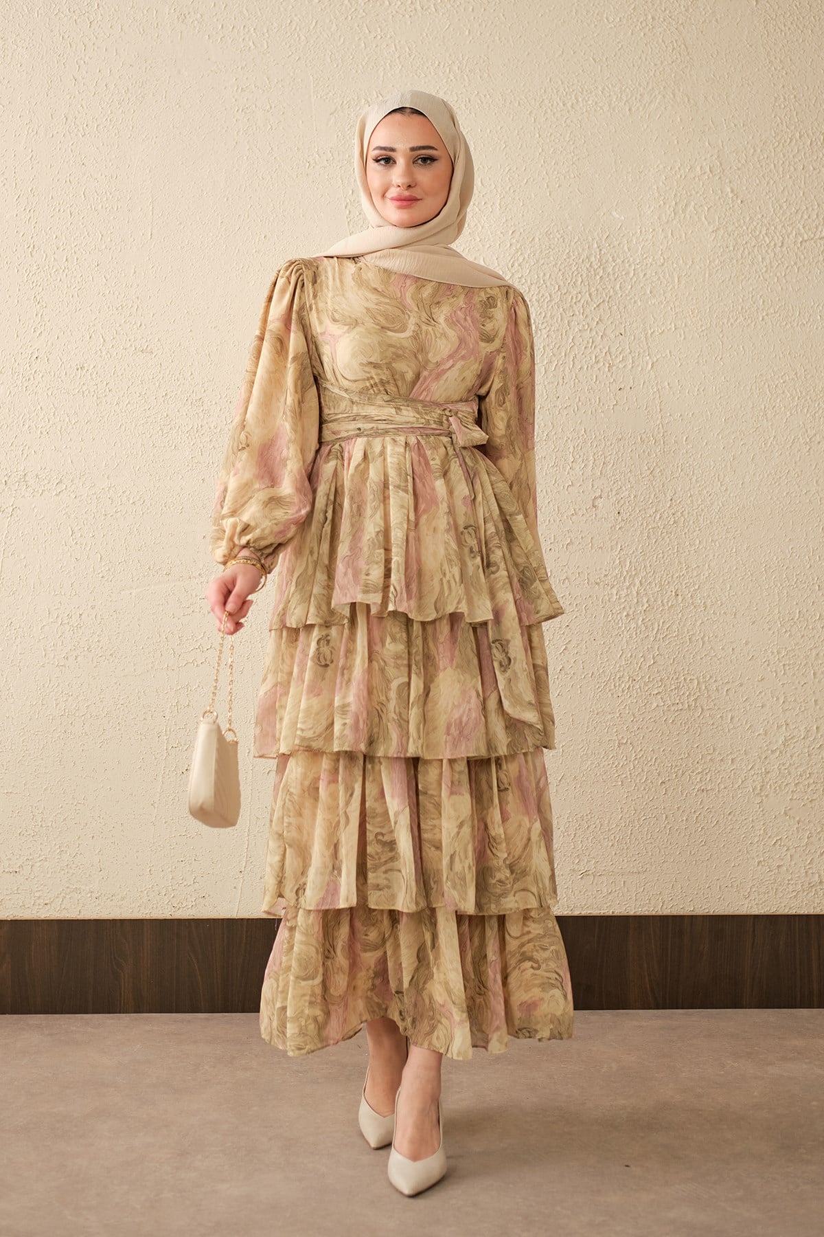 Kat Kat Detay Kuşaklı Astarlı Şifon Elbise Yağ Yeşil