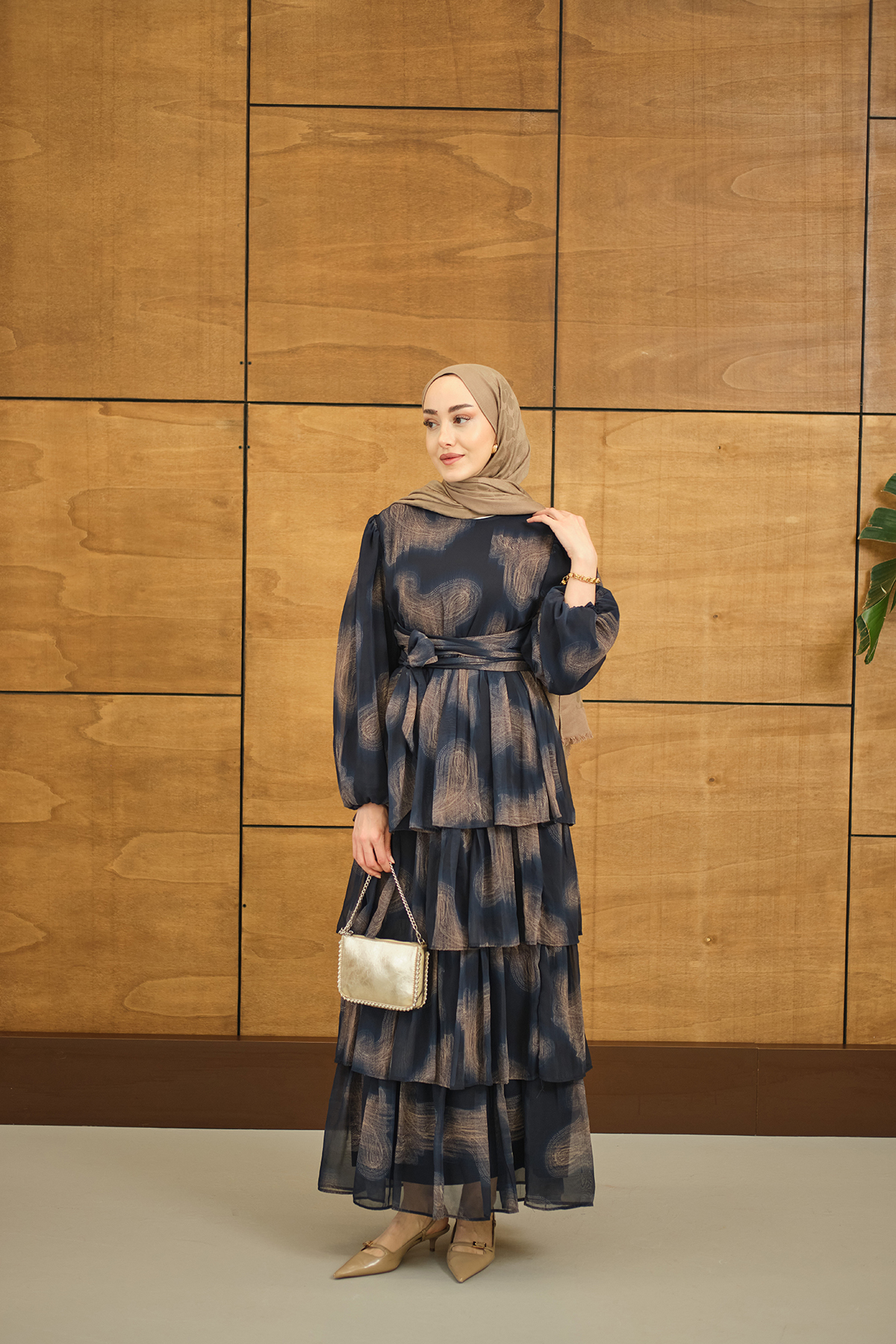 Kat Kat Dökümlü Şifon Elbise Lacivert