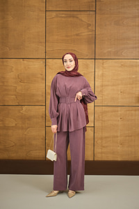 Kemer Detaylı Bisiklet Yaka Takım Gül Kurusu