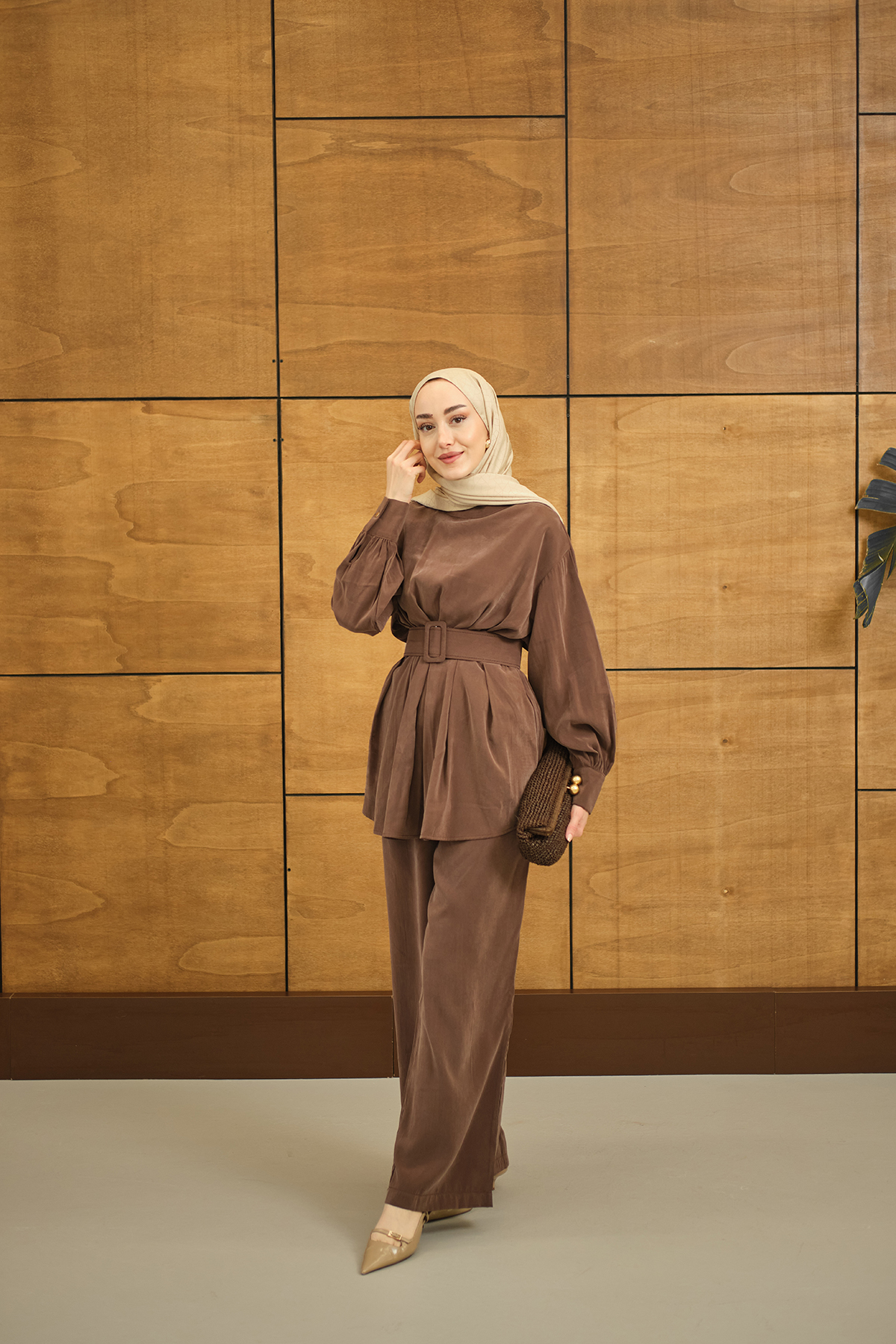 Kemer Detaylı Bisiklet Yaka Takım Kahverengi