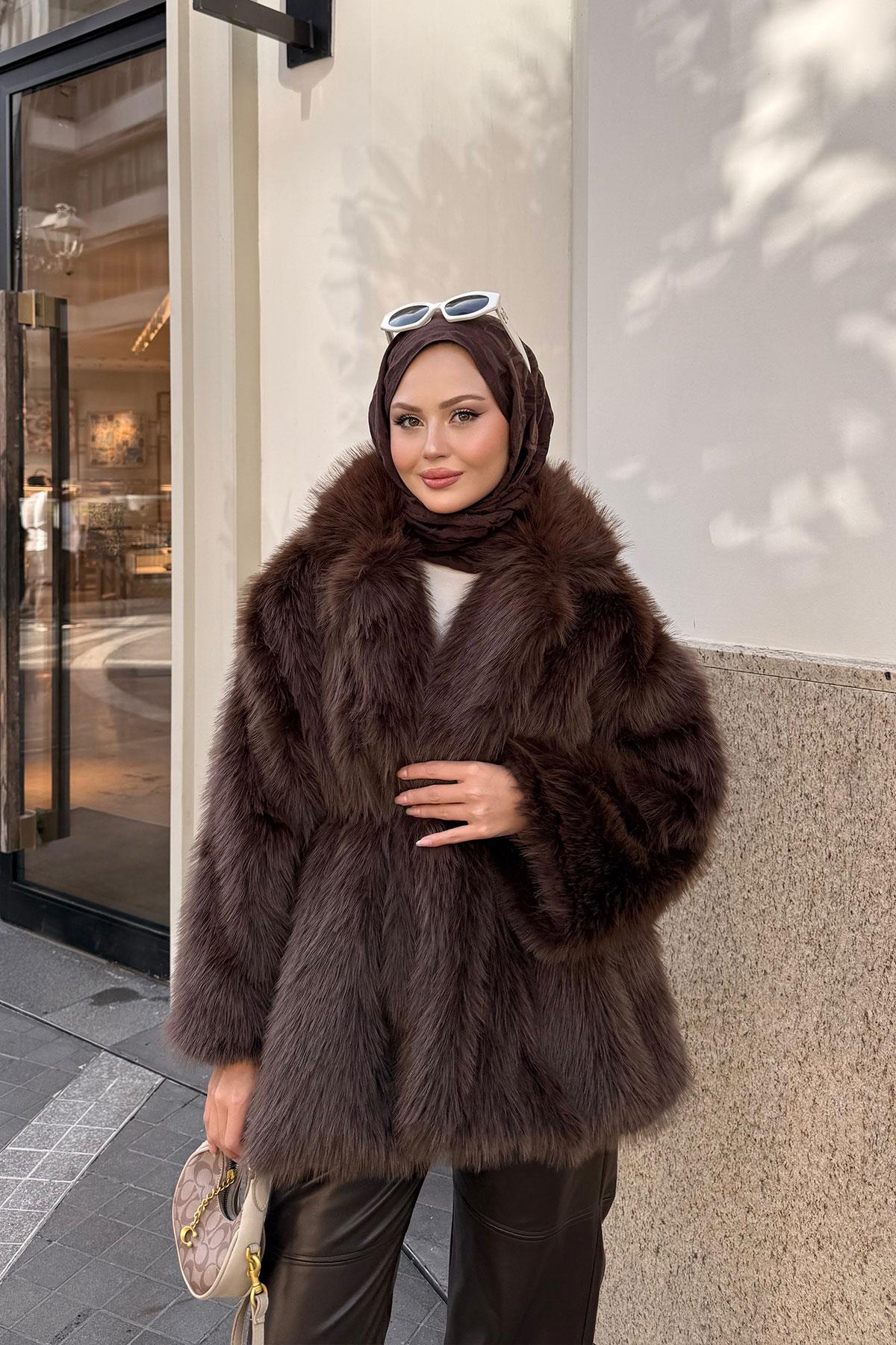 Kemer Detaylı Kürk Kaban Kahverengi