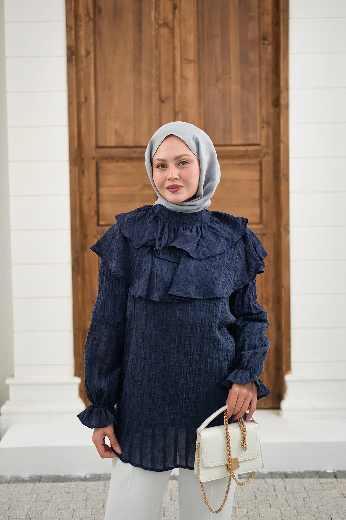 Kendinden Çizgi Desenli Yaka Büzgülü Tunik Lacivert