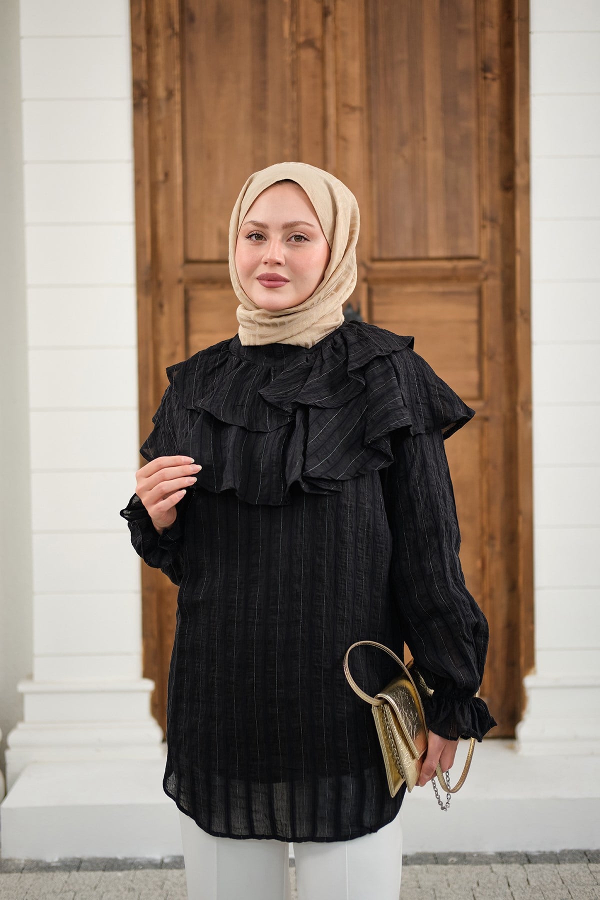 Kendinden Çizgi Desenli Yaka Büzgülü Tunik Siyah