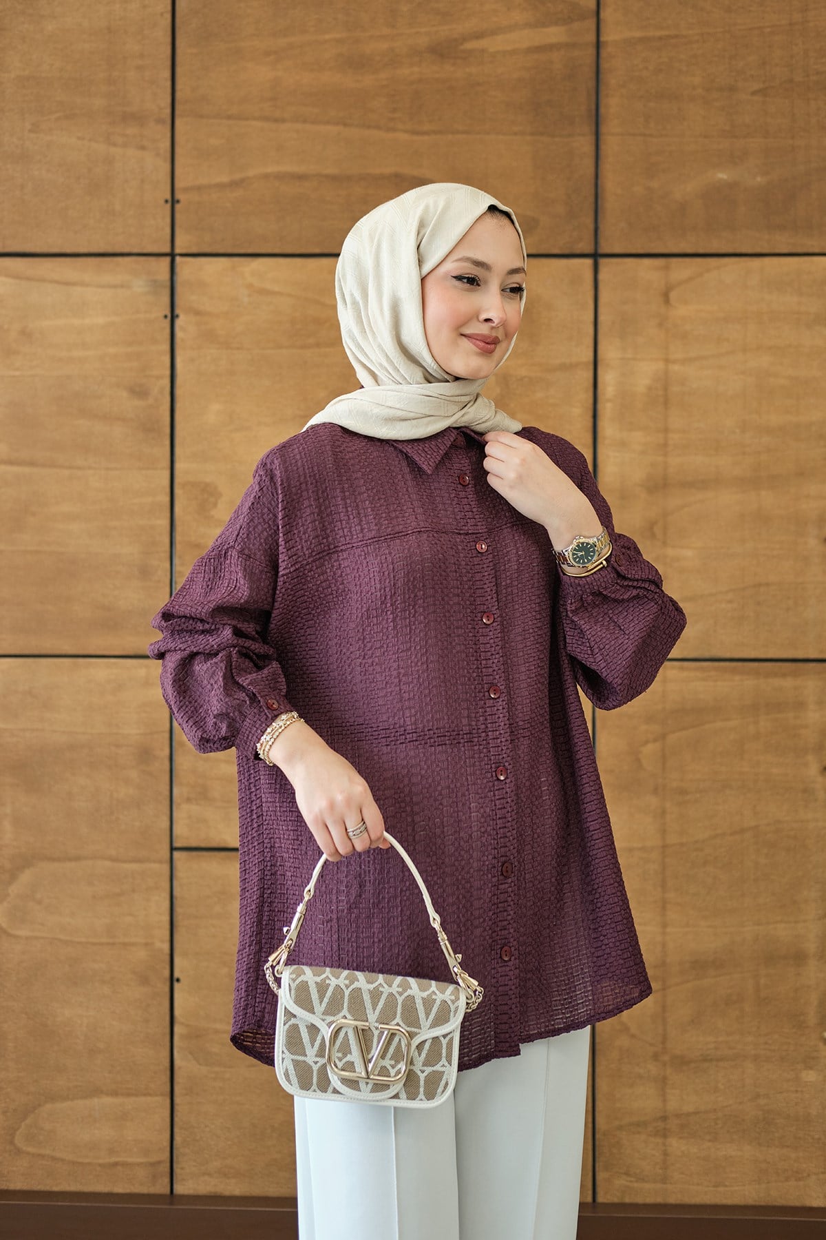 Kendinden Desenli Bel Bağlamalı Mürdüm