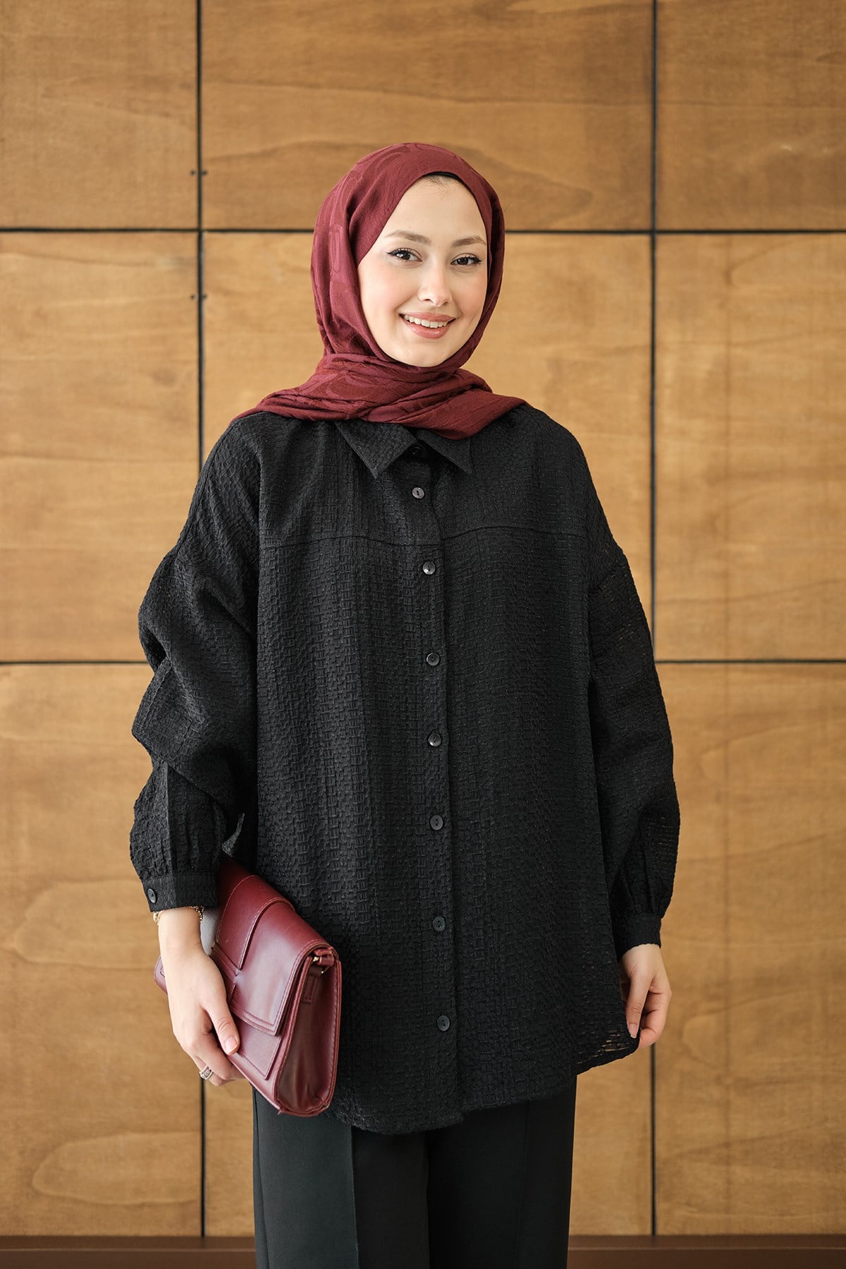 Kendinden Desenli Bel Bağlamalı Siyah