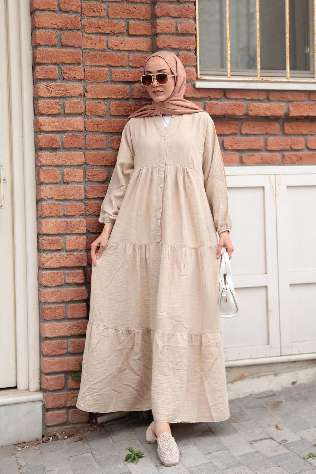 Kendinden Desenli Elbise Krem