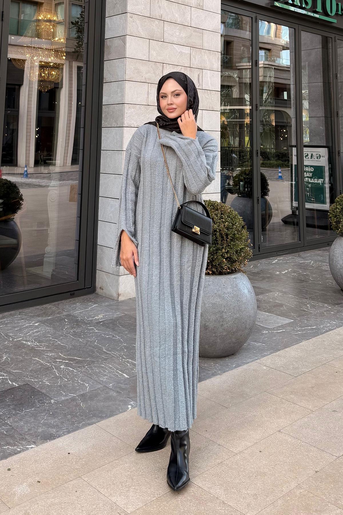Kendinden Desenli Triko Elbise Gri