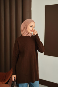 Kendinden Desenli Triko Tunik Kahverengi