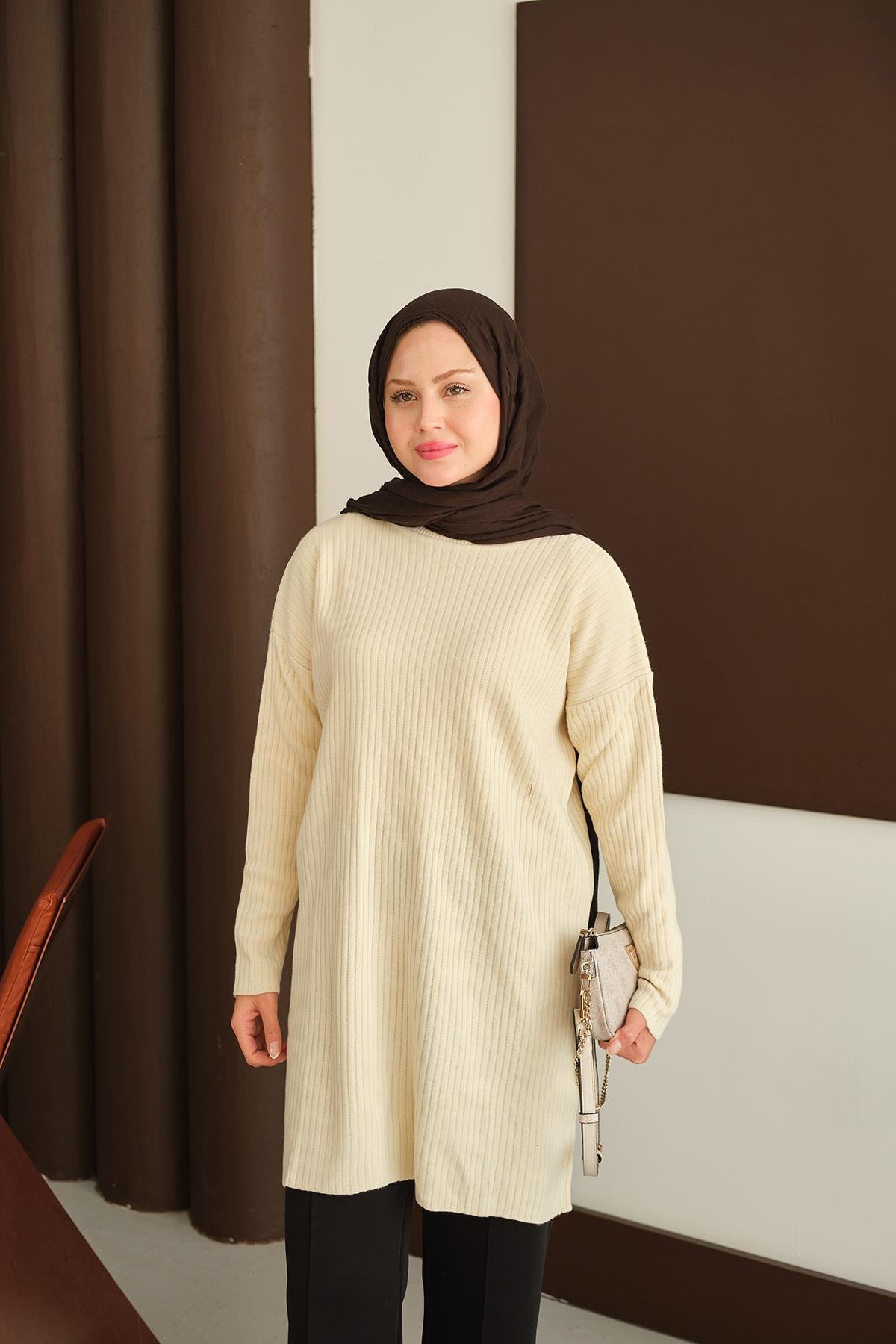 Kendinden Desenli Triko Tunik Krem