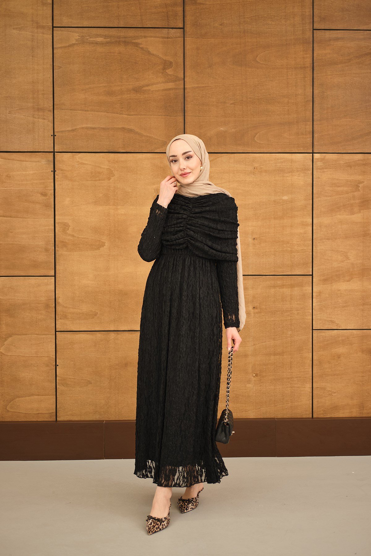 Kendinden Desenli Tül Detay Beli Lastikli Elbise Siyah