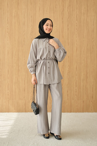 Kırışık Desen Bel Bağlamalı Gömlek Yaka Takım Gri