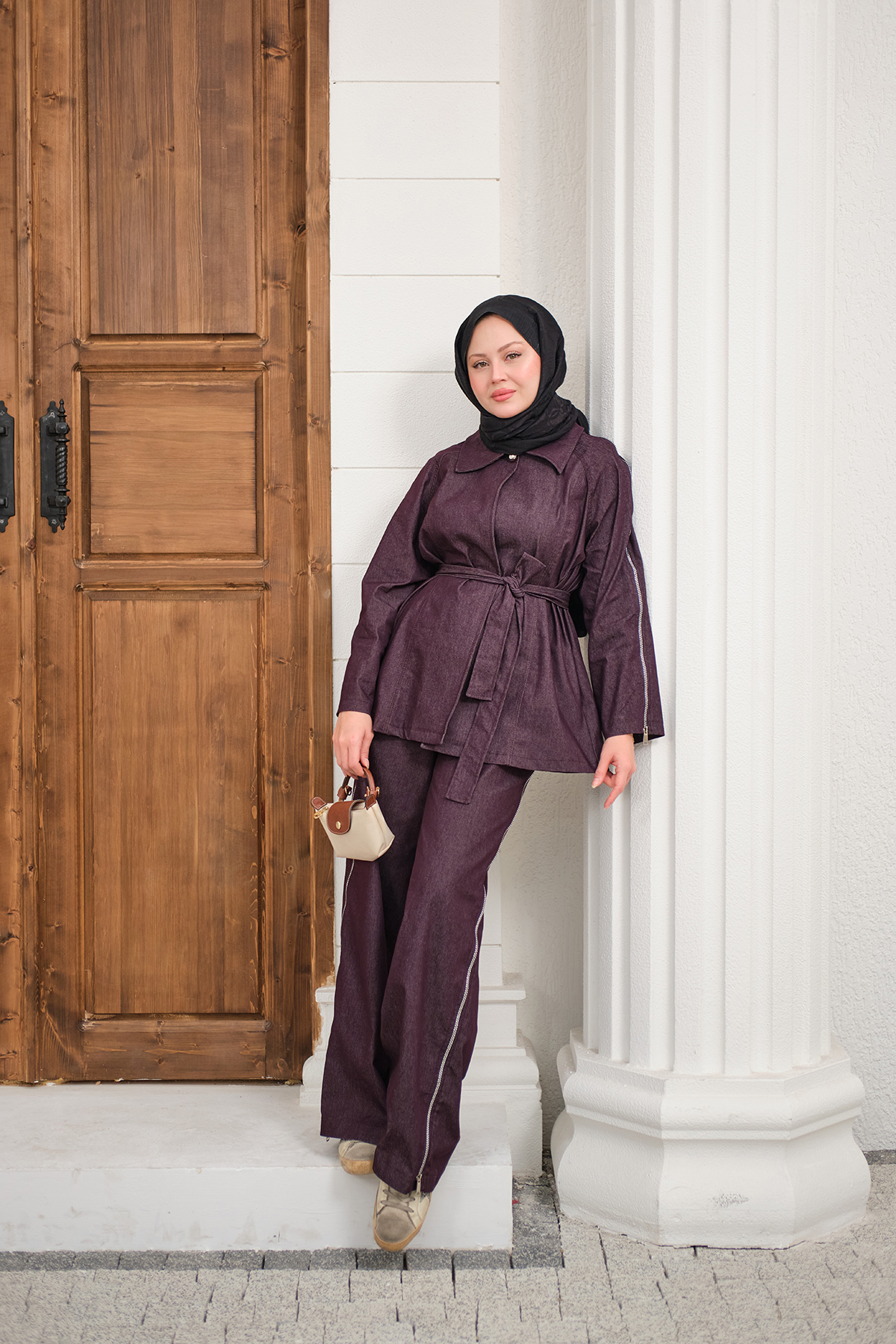Kol Fermuar Detaylı Bel Bağlamalı Tek Düğmeli Takım Mürdüm